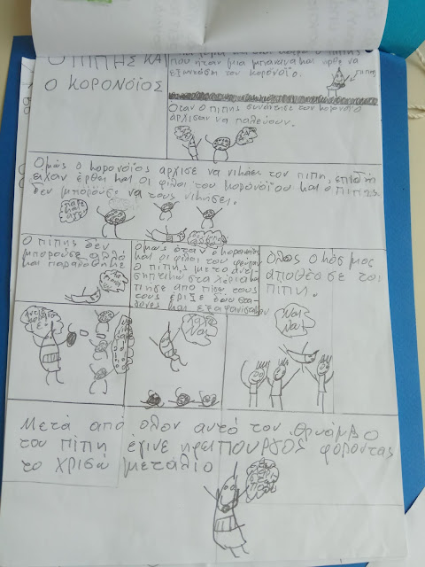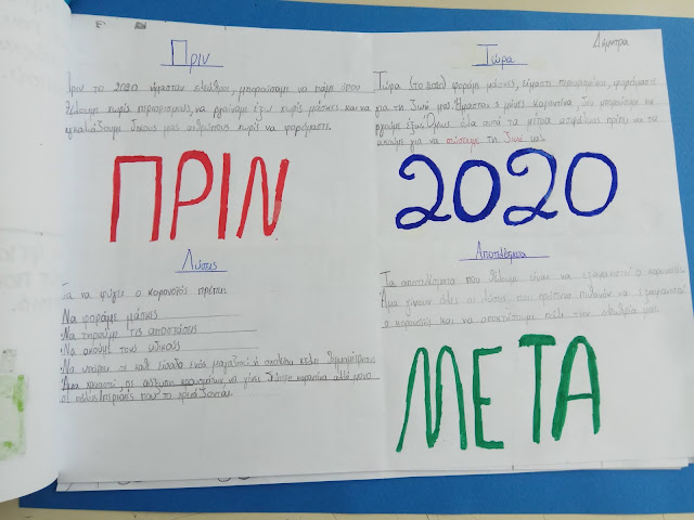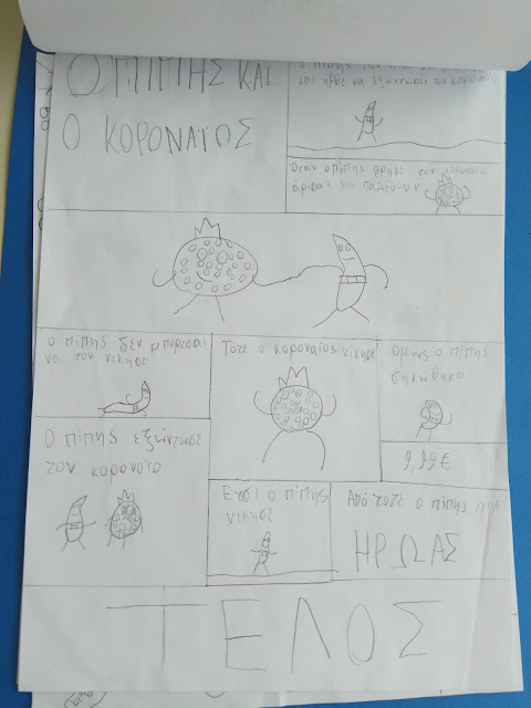 Σε μια προσπάθεια ενημέρωσης των μαθητών του σχολείου μας για την νέα σχολική πραγματικότητα που ζούμε λόγω της πανδημίας covid-19, με σκοπό να κατανοήσουν τι συμβαίνει και να εκτονώσουν τα συναισθήματά τους είδαμε την παιδική ταινία “Ο κορονογιός εξαφανίστηκε”, συζητήσαμε και όπως πάντα τα παιδιά είχαν σπουδαίες ιδέες- προτάσεις-λύσεις. Μερικές από αυτές είναι: