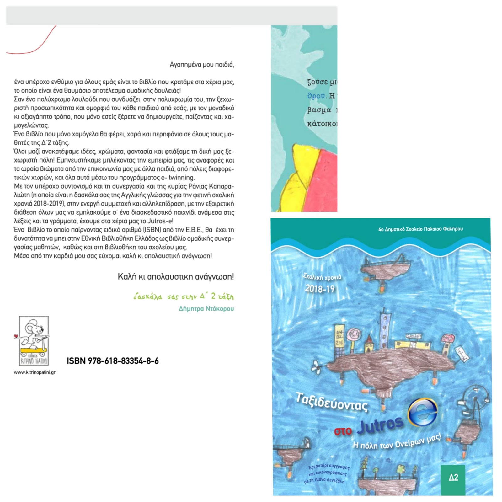 Στα πλαίσια της δημιουργικής γραφής, με διάθεση, πολλή φαντασία, χρώματα και με την ξεχωριστή συνεργασία της συγγραφέα Λιάνας Δενεζάκη, οι μαθητές του περσινού Δ΄2 και η δασκάλα τους Δήμητρα Ντόκορου ετοιμάσαν το υπέροχο βιβλίο με τίτλο «Ταξιδεύοντας στο Jutros e»…Πρόκειται για ένα μοναδικό βιβλίο, αποτέλεσμα ομαδικότητας και οργανωμένης δουλειάς. Οι μικροί συγγραφείς έγραψαν και ζωγράφισαν το δικό τους βιβλίο.